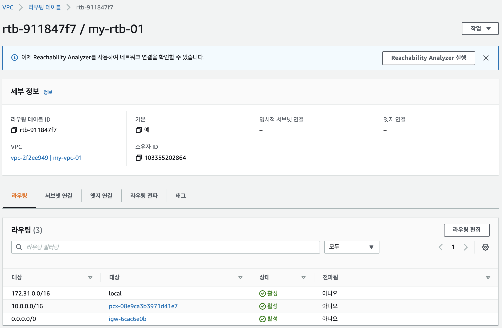 서울리전에서 대상(destination, target)서울리전으로 라우팅 테이블을 편집합니다.