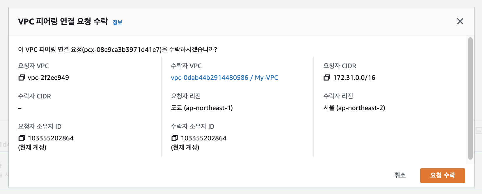서울리전에서 일본리전의 VPC 를 연결하는 설정을 완료합니다.