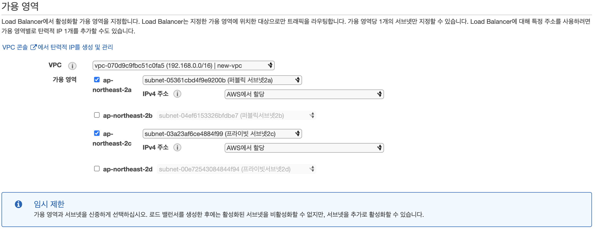 - 가용영역 'ap-northeast-2a', 'ap-northeast-2c'를 선택합니다.