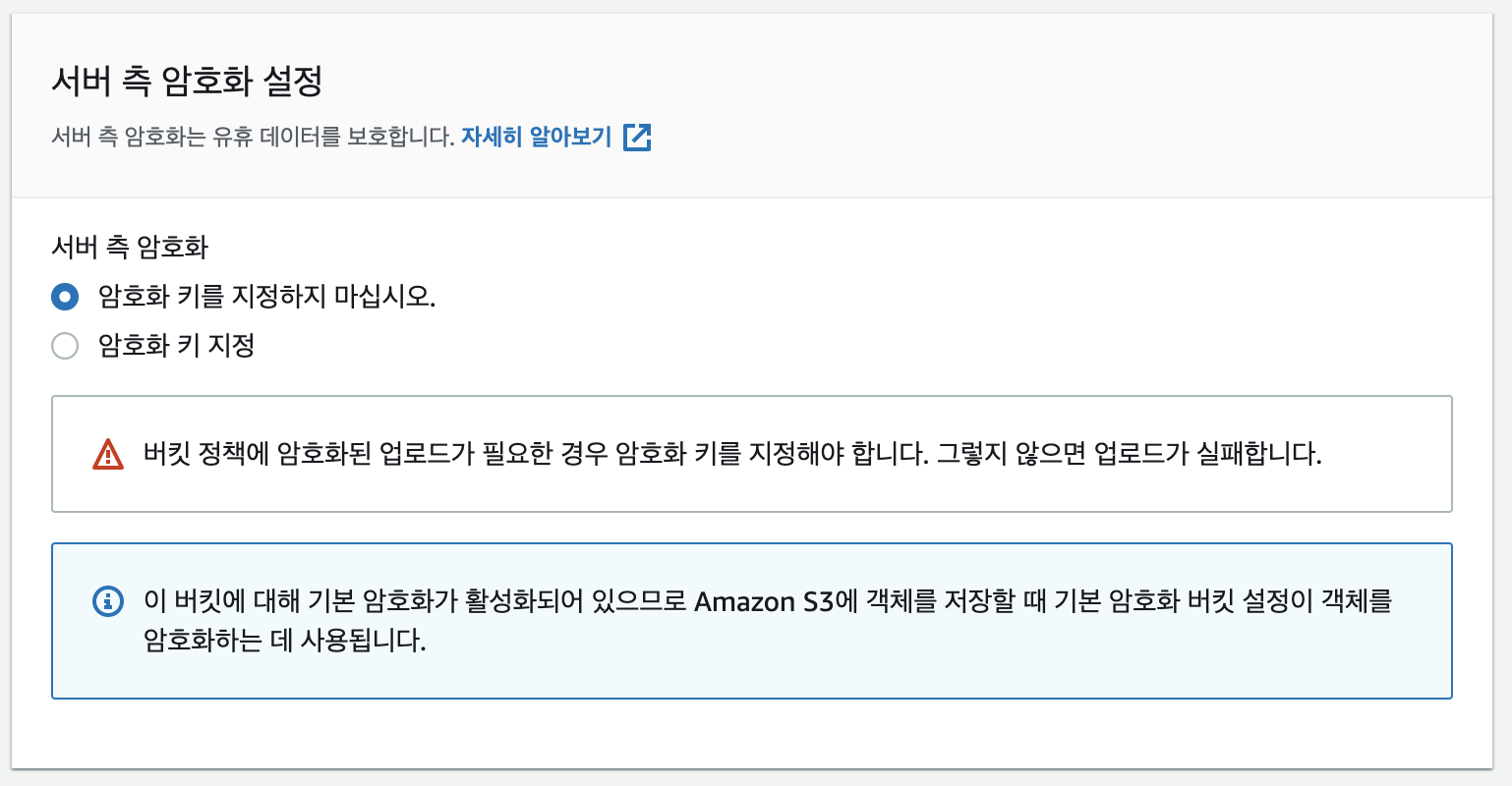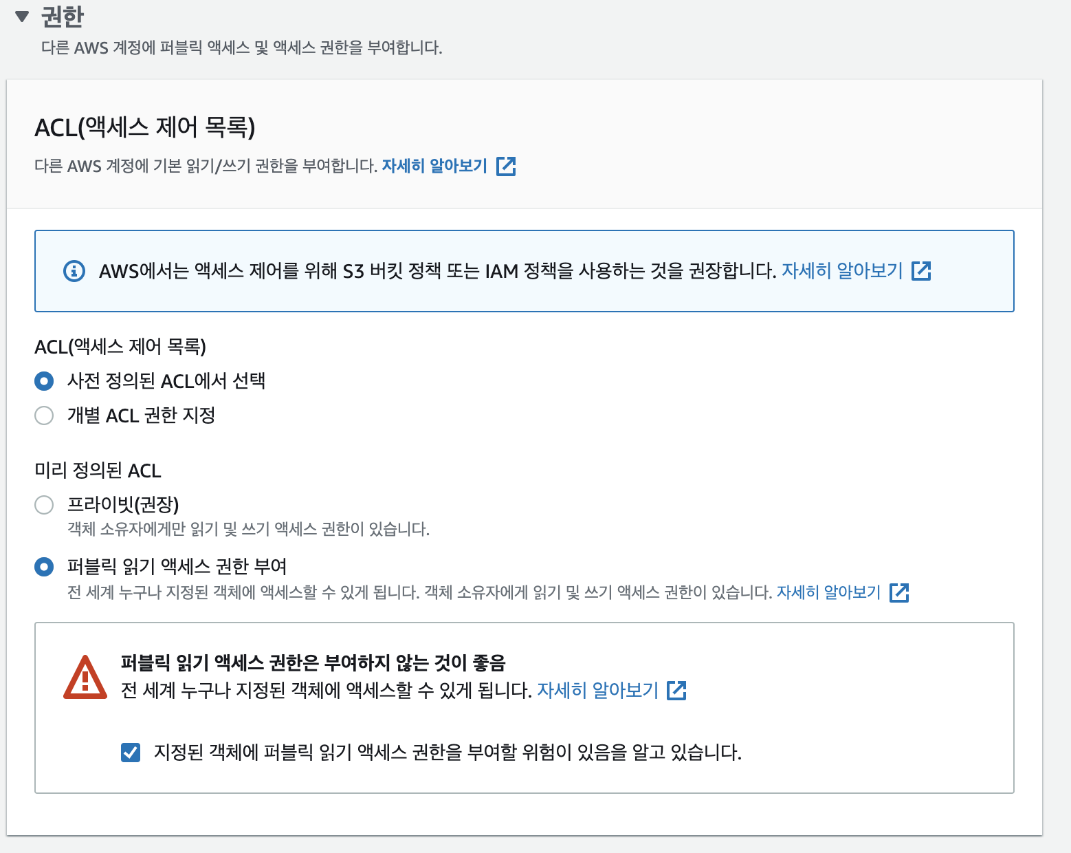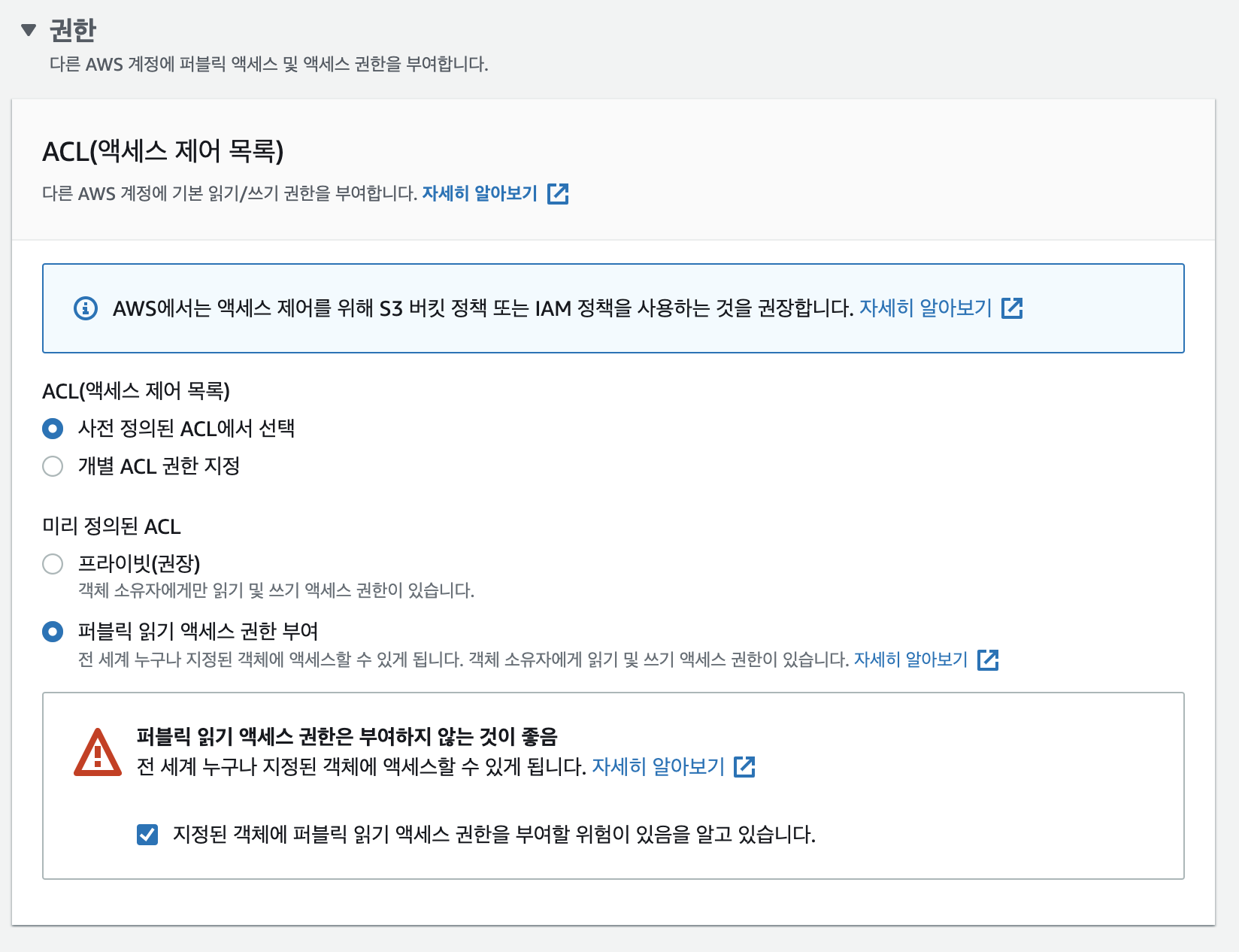 권한은 '퍼블릭 읽기 액세스 권한 부여'를 선택하고 아래 "지정된 객체에 퍼블릭 읽기 액세스 권한을 부여할 위험이 있음을 알고 있습니다."를 체크합니다.