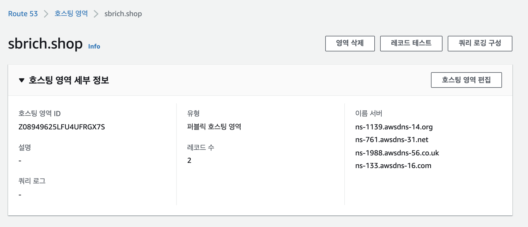 도메인 관리 사이트에 아래의 호스팅 영역 세부정보에서 네임서버를 가지고 설정합니다.