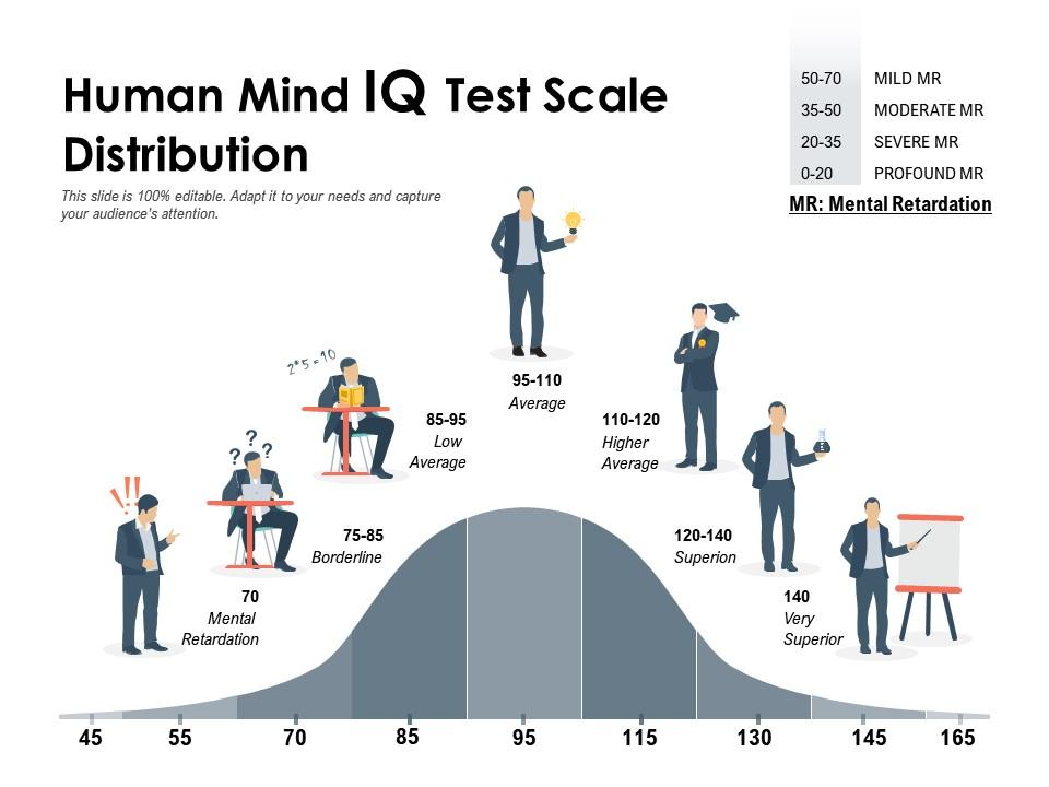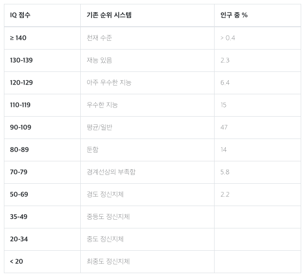 이것은 정의상, 평균적인 사람의 IQ가 100이고 IQ 점수 중 약 95%가 70에서 130 사이라는 걸 의미합니다. IQ 척도는 상대적인 척도입니다. IQ가 가장 높은 사람들은 이론적으로 평균 IQ를 가진 사람들보다 더 똑똑합니다.