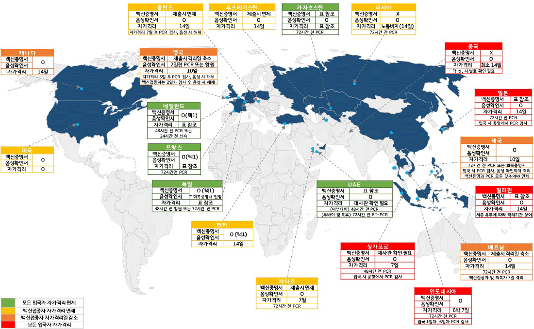 대부분은 '백신 접종 증명서와 코로나19 음성 결과지 소지 시 자가격리 면제'가 되고 있습니다.