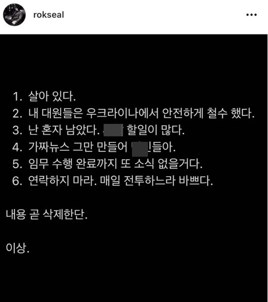 또 “임무 수행 완료까지 또 소식 없을 거다. 연락하지 마라. 매일 전투하느라 바쁘다”며 해당 글을 삭제할 것이라고도 했다.
