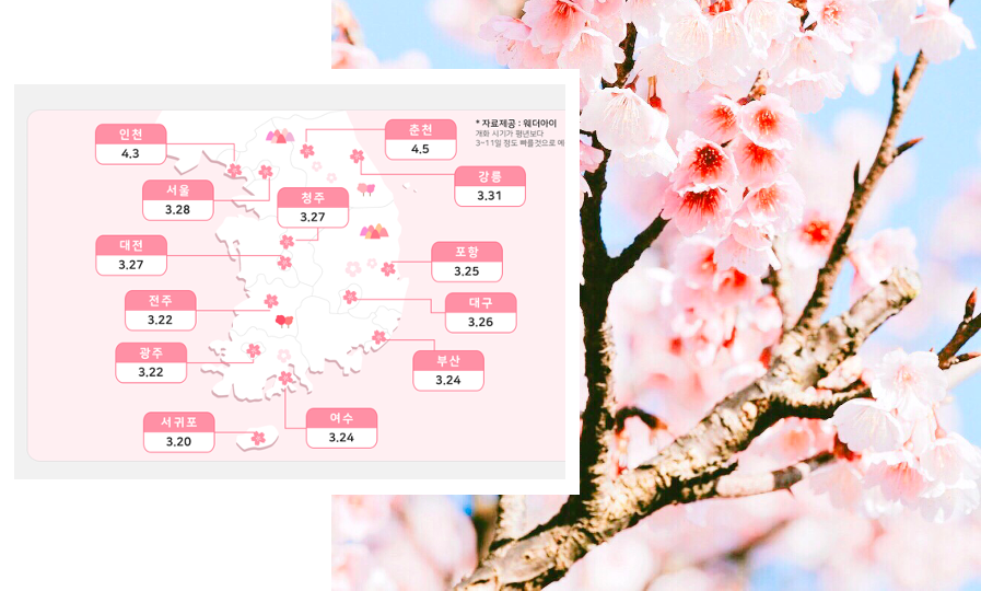 광주·부산의 경우 3월 말, 대구·대전·서울의 경우 4월 초가 벚꽃 만개 시기로 전망된다고 합니다.
