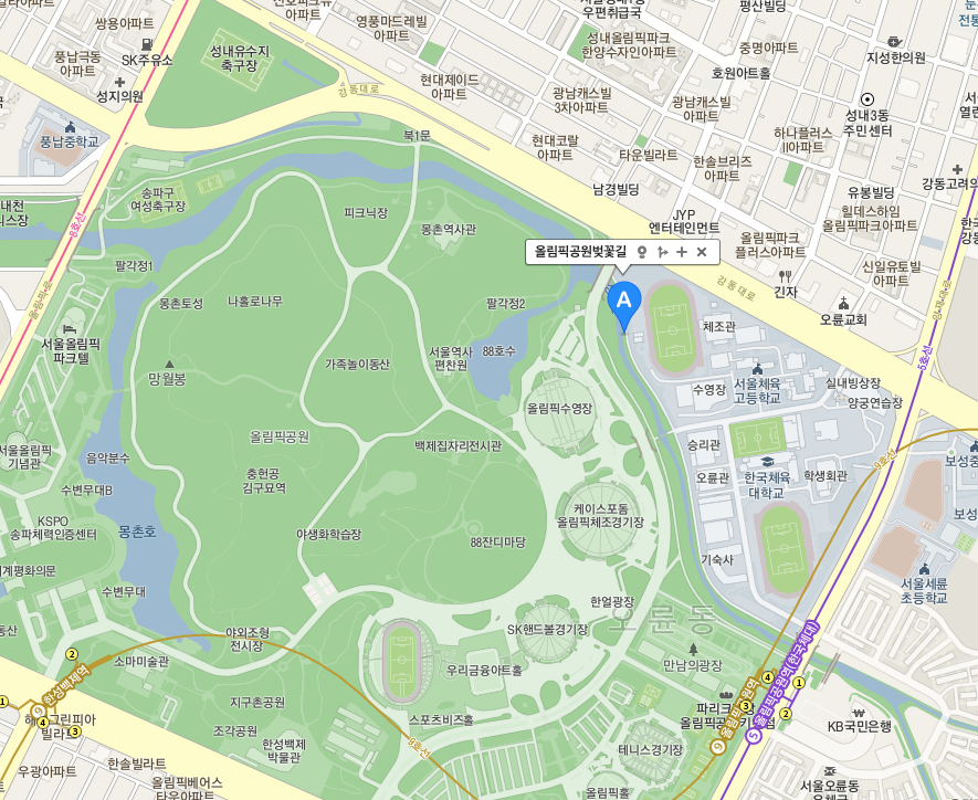 올림픽공원 안으로 들어서면 보이는 벚꽃 풍경이 봄이 왔음을 알려줍니다. 올림픽공원 내에도 벚꽃명소가 있습니다. 바로 올림픽공원 북2문초입에서 이어지는 올림픽공원 벚꽃길은 '서울 벚꽃 명소'입니다.