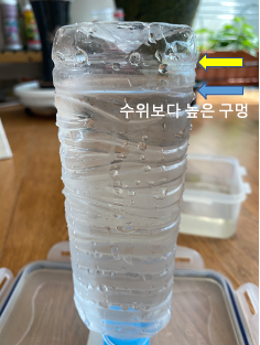 생수병에 물은 구멍보다 낮게 수위를 만들어 채웁니다.