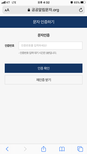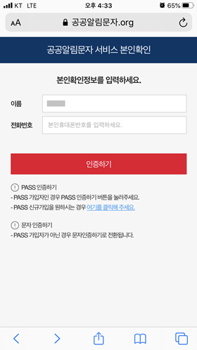 문자를 받으셨다면 ‘안내문 확인하기’의 주소를 눌러 공공알림문자 서비스 사이트에 접속합니다. 본인인증 화면에서 이름과 전화번호를 입력한 뒤 인증번호를 통해 문자인증을 진행하면 안내문을 자세히 열람하실 수 있답니다.