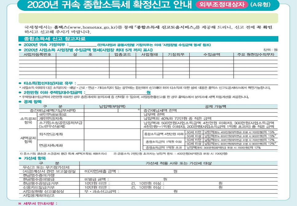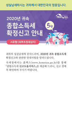 종합소득세 신고안내문은 서면 형태로 우편 발송, 혹은 카카오톡을 통해 모바일로 전송이 되고 있습니다. 위와 같이 안내문에서는 개인별 유형과 종합소득세 신고 참고자료를 확인하실 수 있답니다.
