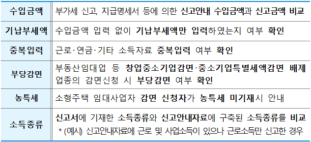 106만 명의 사업자에게는 신고도움서비스를 통해 ‘신고 시 유의할 사항’ 자료를 사전에 안내해 자발적인 성실신고를 지원하겠습니다. 신고 후에는 ‘신고 시 유의할 사항’ 반영 여부를 분석해 신고내용 확인을 실시할 예정이니 성실하게 신고해 주시기 바랍니다.
