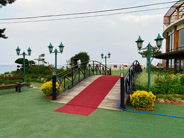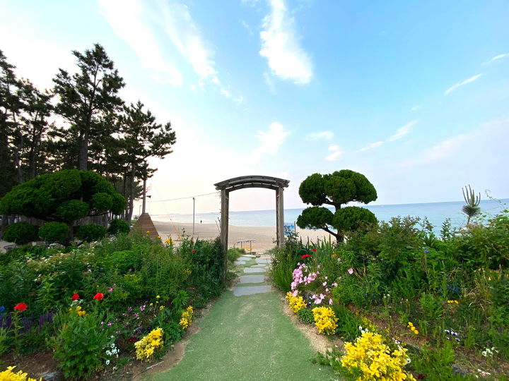 바다정원카페에 오면 들어가기 전에 카페 건물과 정원 해변 사진을 누구나 할 것 없이 찍게 됩니다.