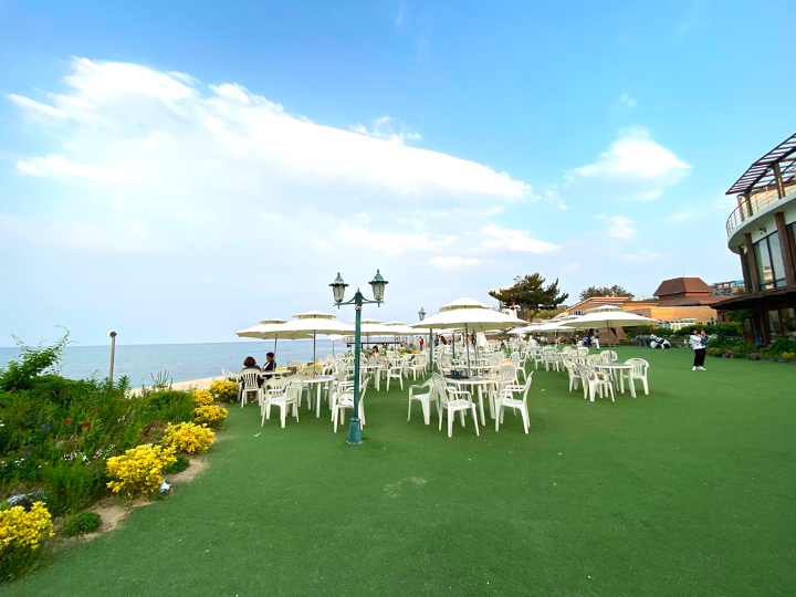 파라솔 테이블이 가득하여 야외에서도 바다를 보면서 담소하고 음료와 디저트를 먹을 수 있습니다.