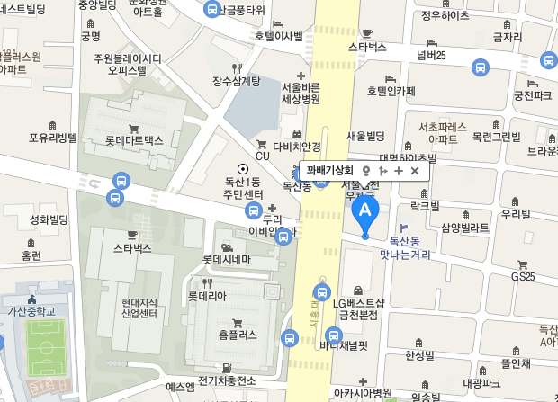 정류소 '금천우체국(중)'과 '홈플러스금천점', '금천우체국.독산1동주민센터'에 정차후 LG베스트샵 금천본점 좌측 도로로 진입하면 보입니다.