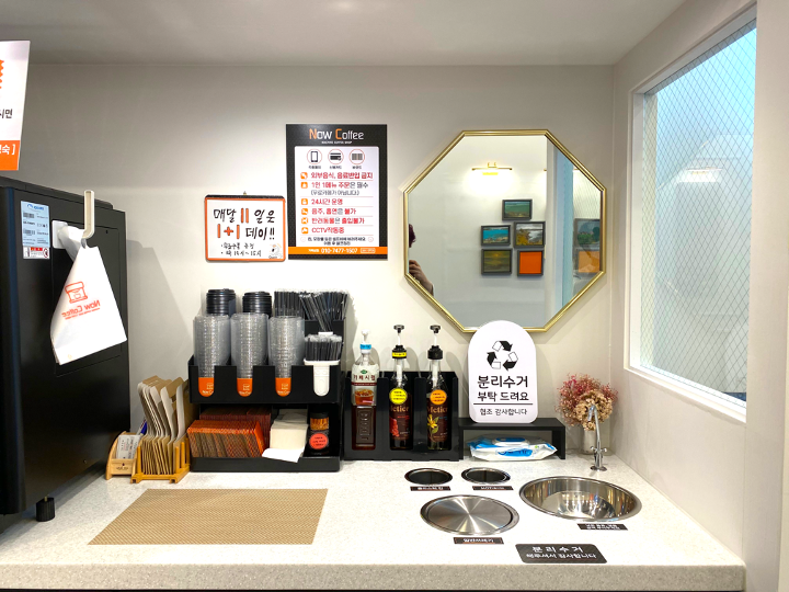 맛있게 드신 음료의 컵과 사용하신 휴지 등의 쓰레기는 셀프 분리수거를 해주시면 됩니다.