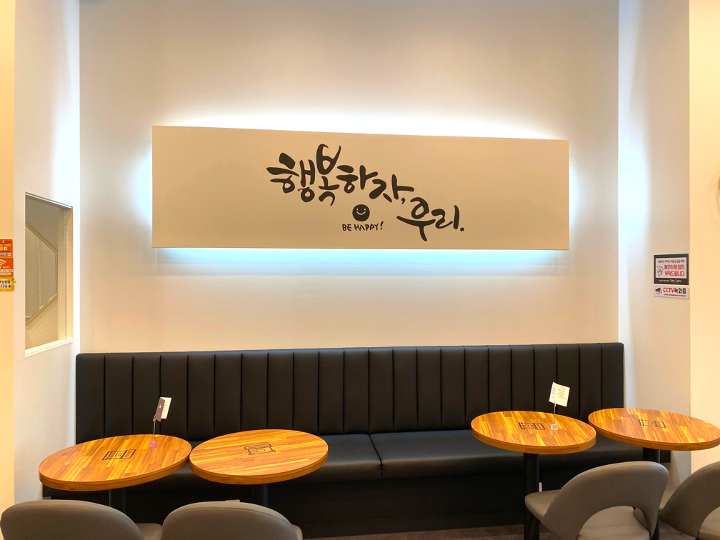 커피머신이 있는 바의 오른쪽에는 사장님의 바램이자 고객님에게 전달하는 카피라이트 문구가 있습니다.