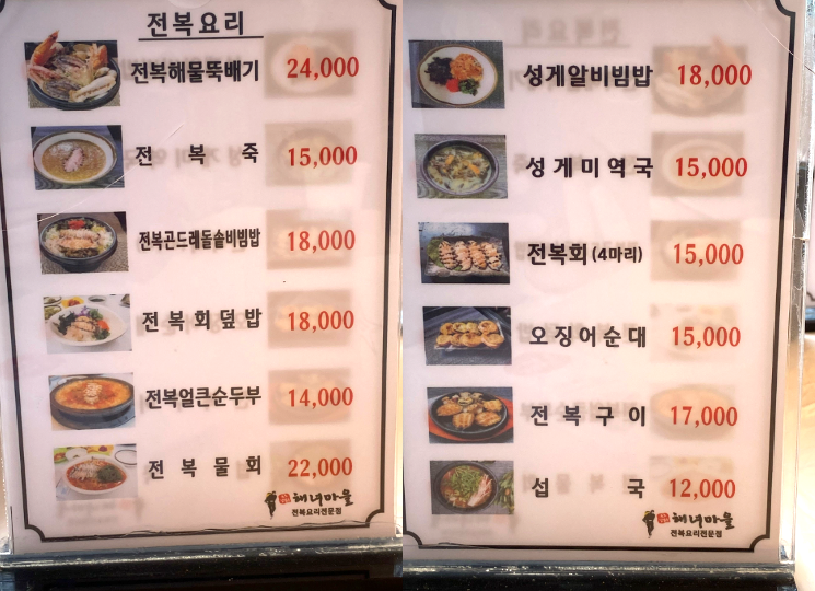 바람꽃해녀마을이 자랑하는 요리의 메뉴는 다음과 같습니다.
