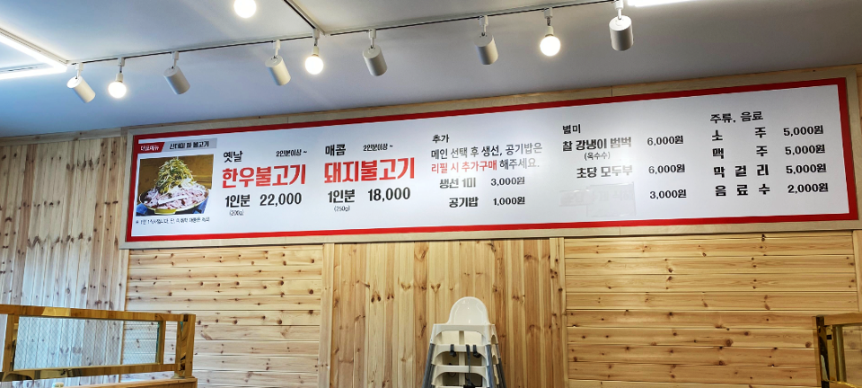 음식은 한우불고기, 돼지불고기 기대해도 좋아요.