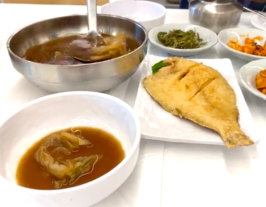 가자미도 잘 구웠는데요. 장국도, 오~ 강하지 않고 좋습니다.