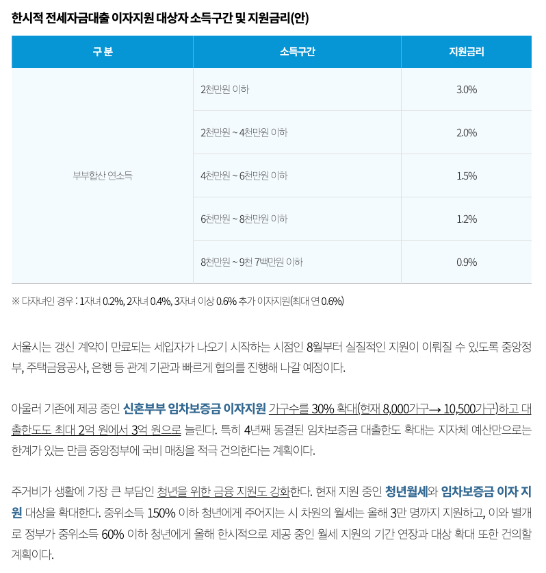 또, 오는 8월부터 내년 7월사이 갱신 계약이 만료되는 저소득 무주택 임차인 대상으로 최장 2년 한시적으로 이자 지원이 시행됩니다.