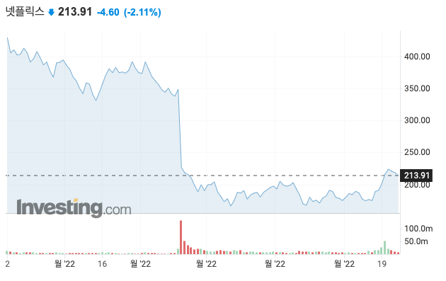 올 초 597달러대였던 넷플릭스 주가는 19일 기준 201.63달러로 3분의 1 토막이 난 상태의 넷플릭스가 바닥을 치고 반등할 수 있을지에 대한 평가로 관심이 쏠리고 있습니다. 넷플릭스의 2분기 유료 가입자 수가 97만명 줄었지만 1분기에 이어 상반기에 총 117만명이 넷플릭스를 떠났습니다. 그러나 시장에서는 선방했다는 평가가 나오는 건, 1분기가 바닥일 수 있다는 의견이 지배적이기 때문입니다.