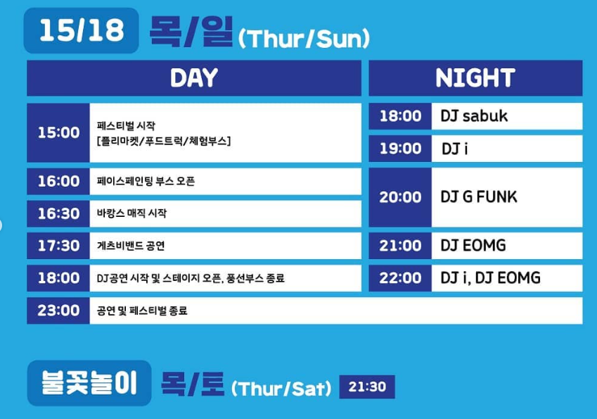 낮에도 볼거리 프로그램(뮤지컬,연극,마술쇼 등)을 즐길 수 있는 축제.