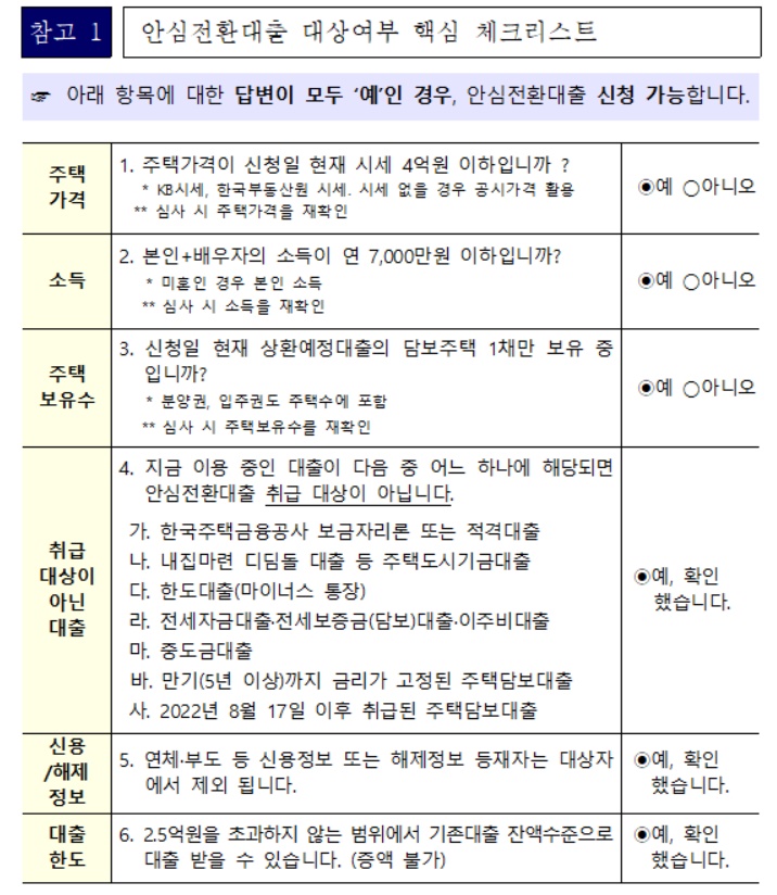 차주는 안심전환대출로 갈아타도 중도상환수수료를 내지 않고 차주별 총부채원리금상환비율(DSR) 규제도 없으며, 주택담보인정비율(LTV)은 70%, 총부채상환비율(DTI)은 60%가 지역과 무관하게 일괄 적용되게 됩니다.