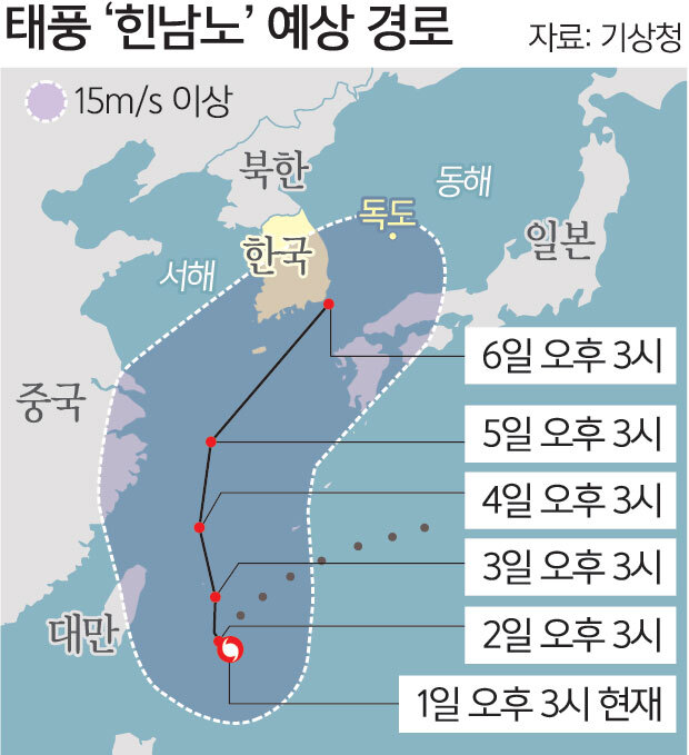 기상청에 따르면 1일 오후 3시 기준 힌남노는 대만 타이베이 동남쪽 480㎞ 해상을 지나 남서진하고 있습니다. 태풍은 이 근처에서 한동안 머물다 2일 밤부터 갑자기 방향을 틀어 한반도를 향해 북상할 것으로 예상이 됩니다. 이후 5일 오전 9시 ‘매우 강’인 상태로 제주 서귀포시 남남서쪽 470㎞ 해상까지 올라와 이튿날 제주 동쪽 해상을 지날 것으로 보입니다.