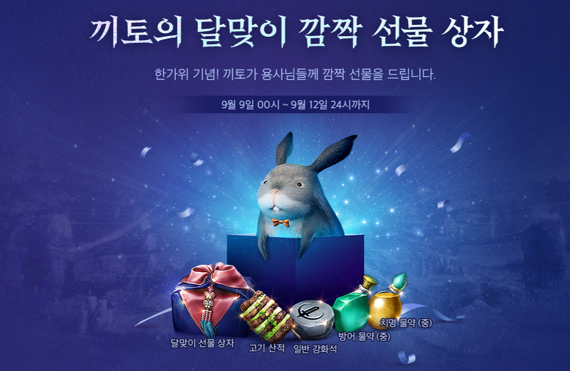 또한, 8일부터 일주일간 미르 대륙에 나타난 한가위 몬스터를 사냥하면 특별한 보상이 주어진다. 9일부터 12일까지는 게임에 접속하는 모든 이용자 대상으로 장비 강화석, 버프 물약 등 다채로운 아이템을 선물하는 깜짝 이벤트를 실시한다.