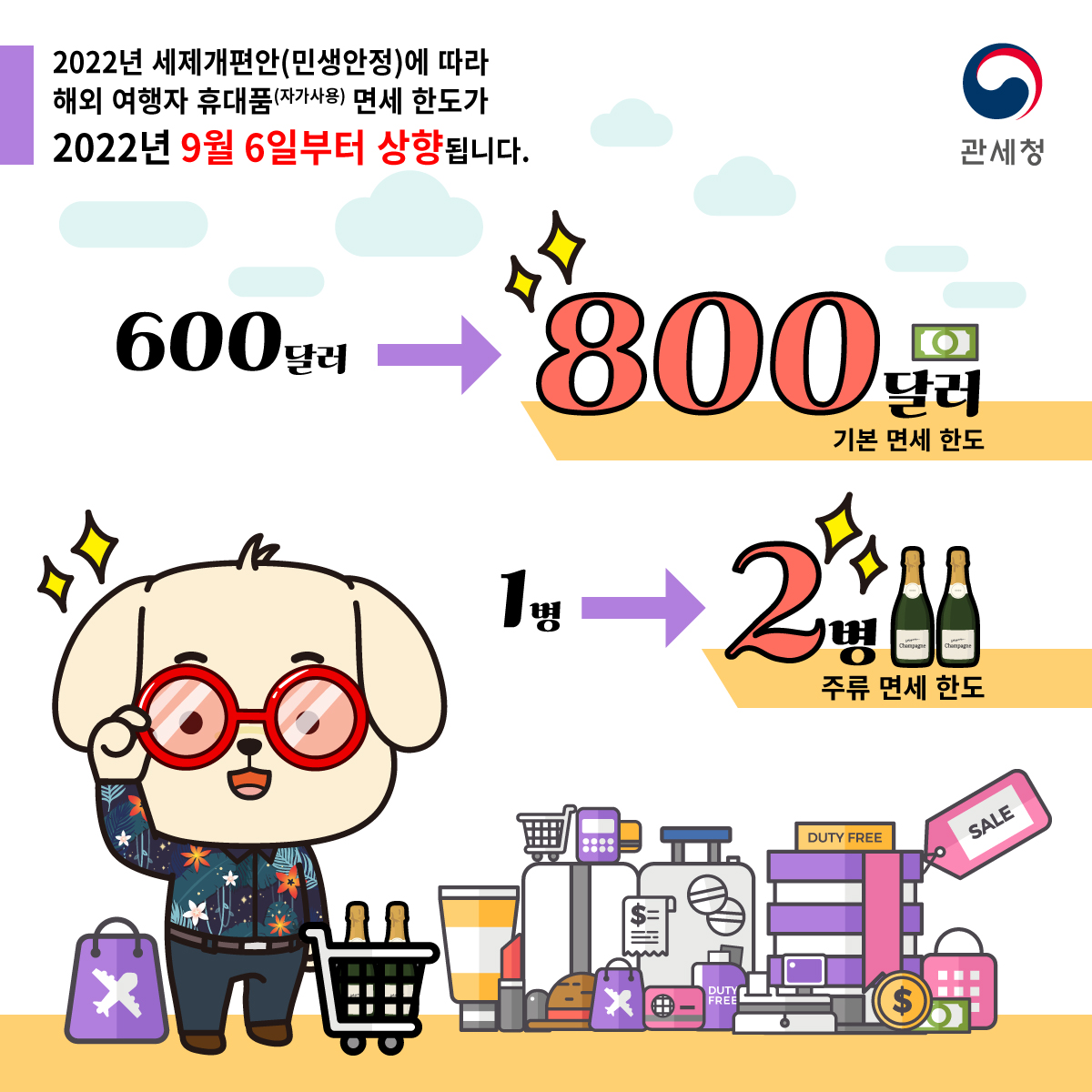 관세법 시행규칙 개정안 입법예고 해외에서 들어오는 여행자에 적용되는 면세 한도가 600달러에서 800달러로 높아집니다.
