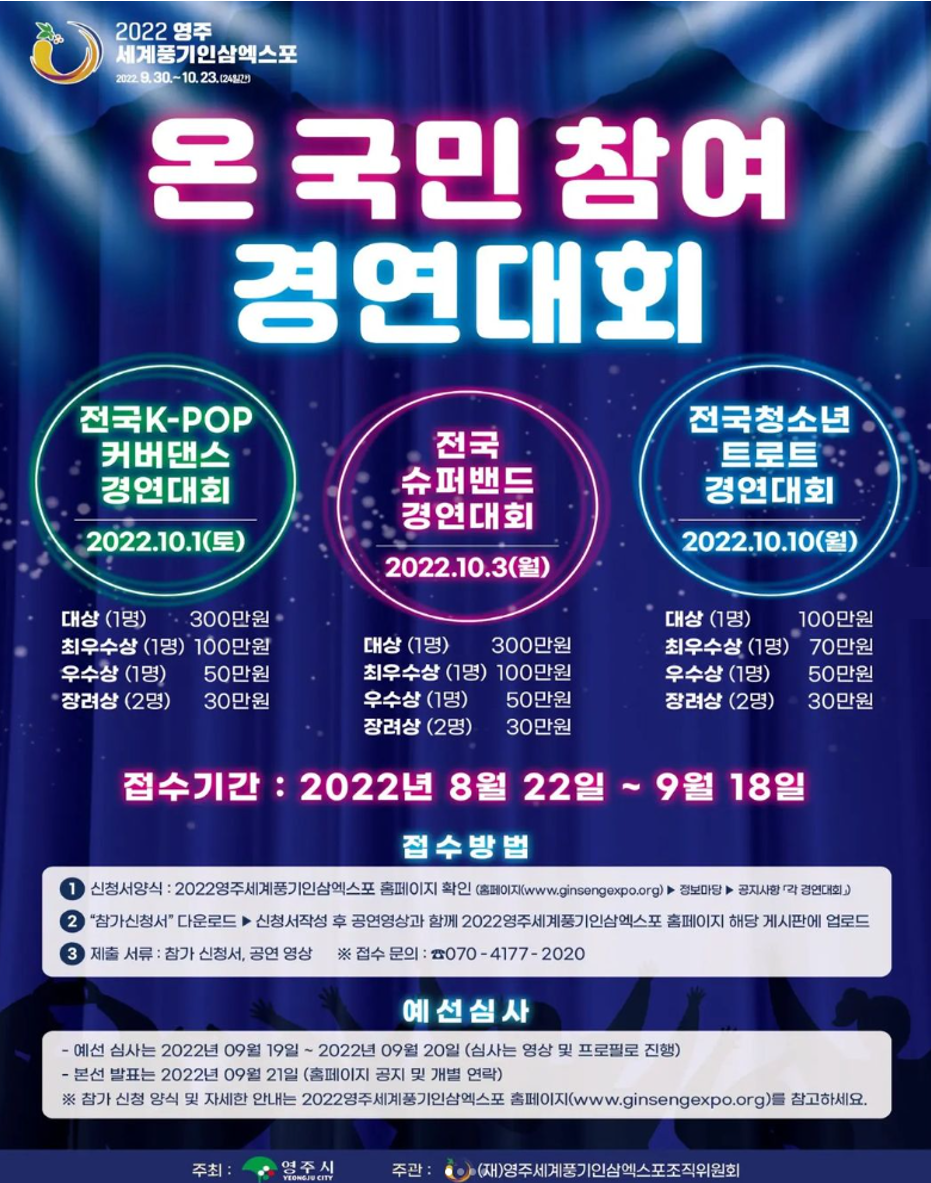 2022영주세계풍기인삼엑스포 성공적인 개최를 위하여 전국의 많은 사람들의 끼와 재능을 펼칠 수 있는 장을 만든다고 합니다.