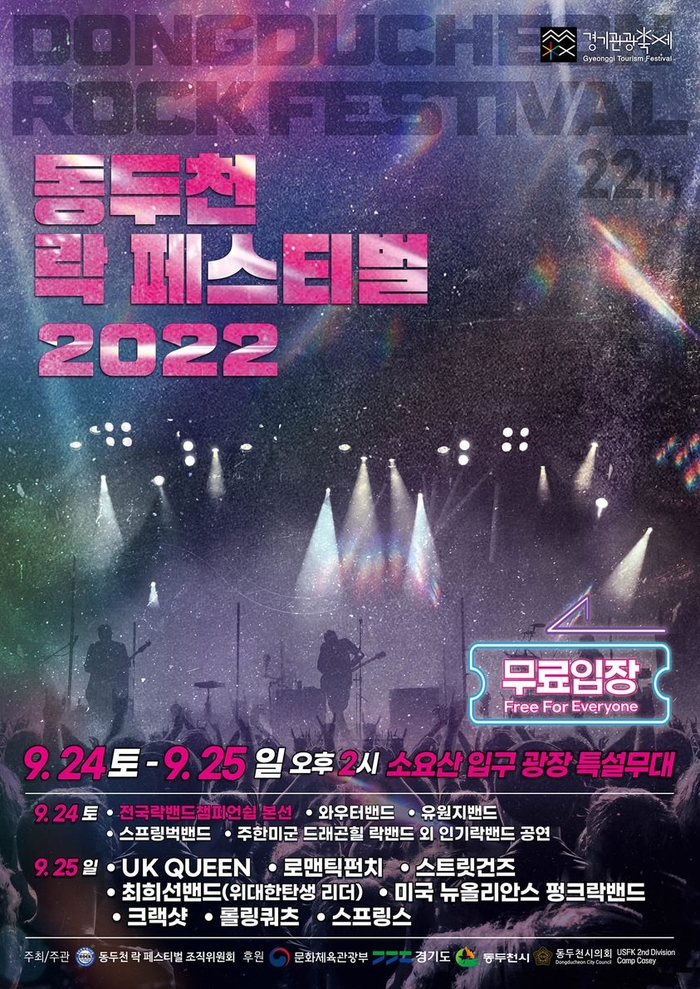 올해로 22년 째를 맞이하는 이번 행사는 ‘동두천락페스티벌조직위원회’가 주최하고 문화체육관광부와 경기도, 동두천시, 동두천시의회가 후원, ‘자유와 희망을 향한 두드림 그 젊음의 전설’의 테마로 정해 아마추어 록밴드의 멋진 실력과 함께 국내 최정상 락밴드의 축하공연 등으로 이어져 현장은 열광의 도가니가 될 전망입니다.
