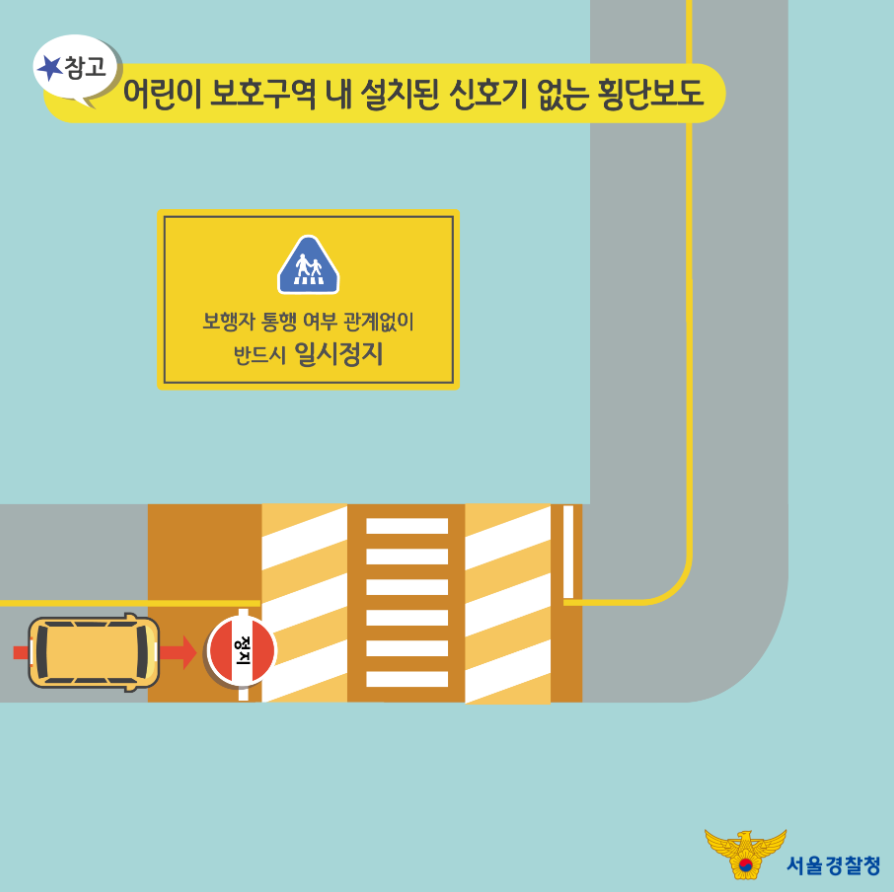 A. “법의 취지는 보호구역에서 갑자기 어린이가 횡단보도에 나타나는 경우에도 사고를 방지하기 위한 것이다. 차량 정체 등으로 정차했더라도 보호구역 내 신호기 없는 횡단보도 앞에서는 일시정지 하는 것이 필요하다.”