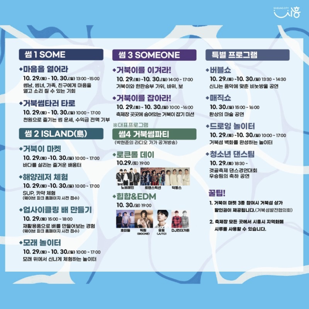 #가볼만한곳 #시흥가볼만한곳 #가볼만한축제 #시흥축제 #시흥거북썸축제 #마음을열어라 #거북이마켓 #거북이팔찌 #거북썸파티 #해양레포츠 #거북섬둘레길 #추천축제 #가을축제 #해양축제 #웨이브파크 #정왕역 #오이도역 #상가할인권 #가족여행 #커플여행 #연인끼리 #아이와함께 #관광지 #오빠랑거북섬여행 #오빠랑거북썸축제 #추천여행지 #오빠랑가볼만한곳 #거북썸파티 #아쿠아펫랜드 #청소년댄스팀 #매직쇼 #버블쇼 #시흥여행 #초청가수 #공연라인업 #라인업