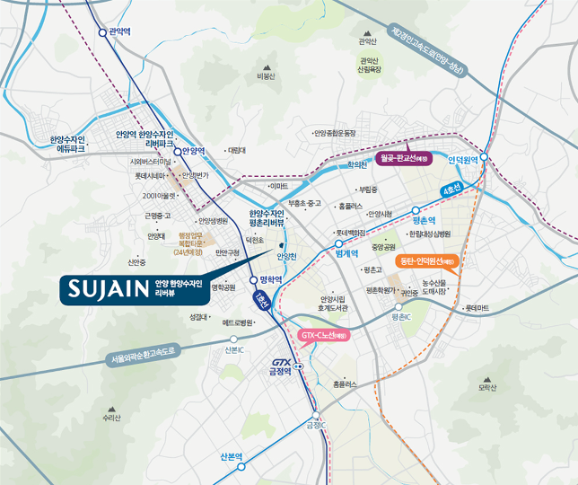단지는 1호선 명학역과 4호선 범계역이 모두 도보권에 위치해 있으며, 안양과 평촌 생활권 모두 접근이 용이합니다. 이마트와 롯데백화점, 뉴코아 아울렛 등 편의시설과 덕천초, 평촌학원가 등 교육인프라 접근성도 뛰어나 높은 주거편의성을 제공할 전망이다. 안양천이 바로 앞에 위치해 있고, 호계근린공원, 비봉산힐링공원 등 쾌적한 자연환경이 주변에 위치해 산책과 여가를 즐기기에도 좋습니다.