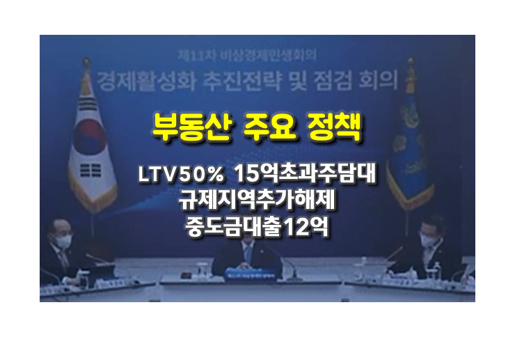 #부동산정책 #주택시장정책 #무주택자LTV50퍼센트 #1주택자LTV50퍼센트 #투기과열지구해제 #조정대상지역해제 #15억초과주담대허용 #규제지역추가해제 #분양가12억이하중도금대출 #신규아파트중도금대출 #청약당첨기존주택처분기한2년연장 #국토교통부 #금융위원장 #주택도시보증공사 #한국주택금융공사 #9억원규제