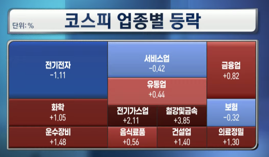 철강및금속(3.85), 전기가스업(2.11), 운수장비(1.48), 화학(1.05) 등 상승하고 전기전자(-1.11), 서비스업(-0.42), 보험(-0.32) 하락하고 있습니다.