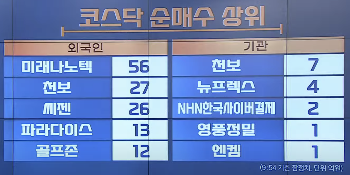기관은 천보(7억), 뉴스렉스(4억), NHN한국사이버결제(2억), 영풍정밀(1억), 엔켐(1억) 순매수 중입니다.