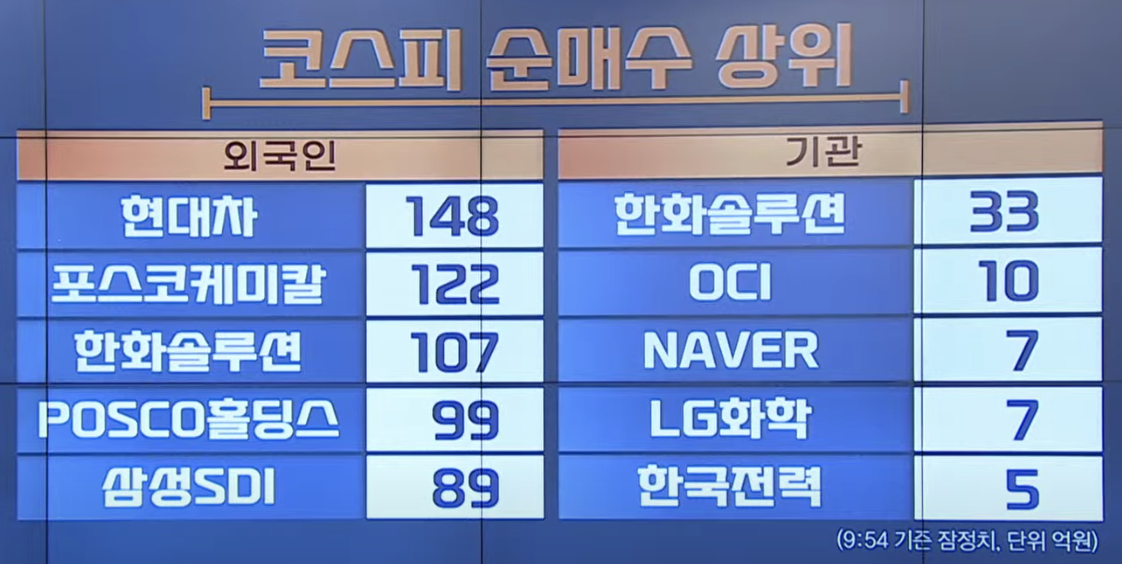 외국인은 현대차(148억), 포스코케미칼(122억), 한화솔루션(107억), POSCO홀딩스(99억), 삼성(SDI89억) 순매수 중이고