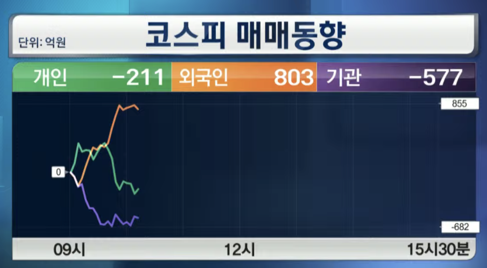 개인은 211억원 순매도, 외국인 803억원 순매수, 기관 577억원 순매도 입니다.