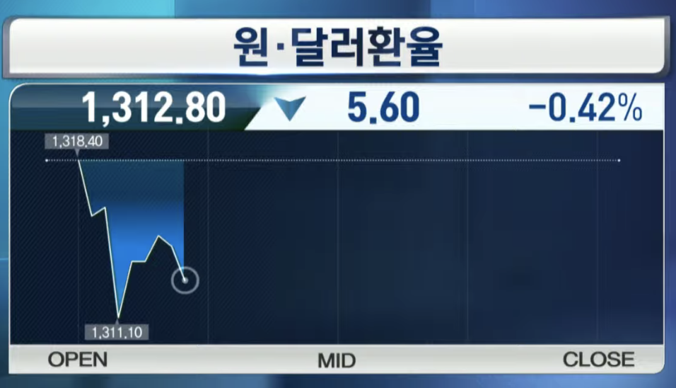 원달러환율은 5.60하락한 1,312.80원을 보여주고 있습니다.