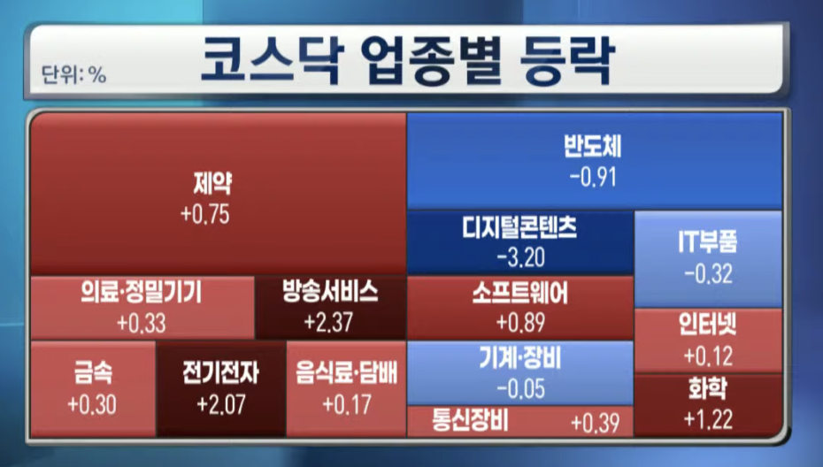 방송서비스(2.37), 전기전자(2.07), 화학(1.22), 소프트웨어(0.89), 제약(0.75) 상승 중이고 디지털컨텐츠(-3.20), 반도체(-0.91), IT부품(-0.32), 기계장비(-0.05) 하락 중입니다.