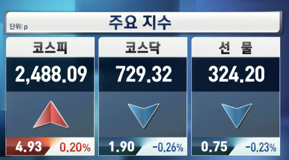 코스피는 4.93포인트 상승한 2,488.09로 강보합이고