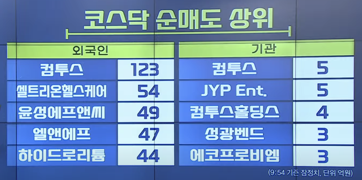 기관은 컴투스(5억), JYP Ent(5억), 컴튜스홀딩스(4억), 성광벤드(3억), 에코프로비엠(3억) 순매도 중입니다.