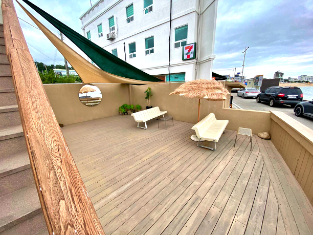 건물 우측 편 공간에 있는 테이블과 파라솔. 날 좋을 때 여기 앉아서 바다와 하늘을 보고 있으면 좋겠지요.