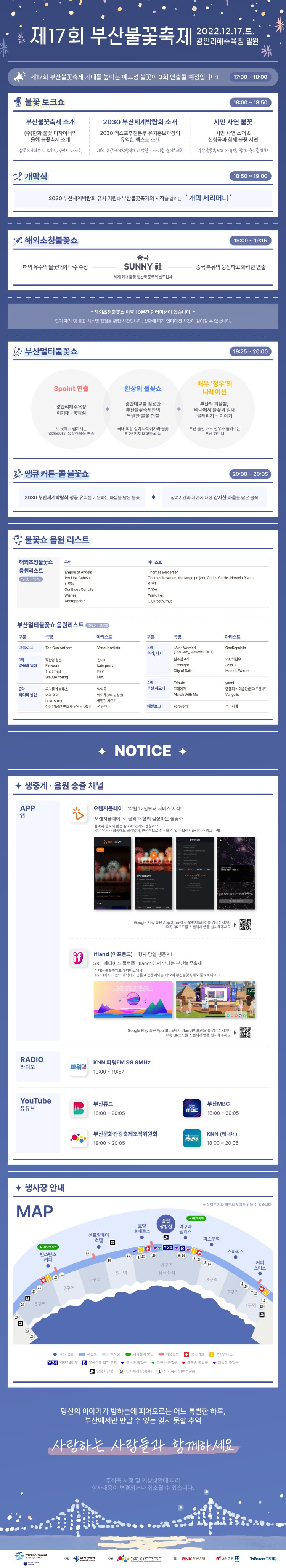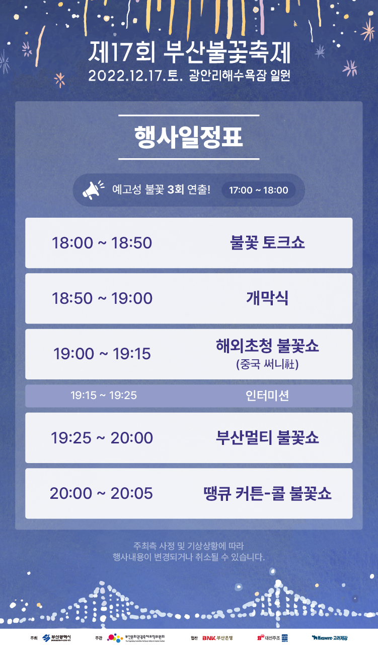 이 정보를 참조하시면 12월 17일(토) 불꽃 축제 행사내용과 타임테이블을 참고하실 수 있습니다.