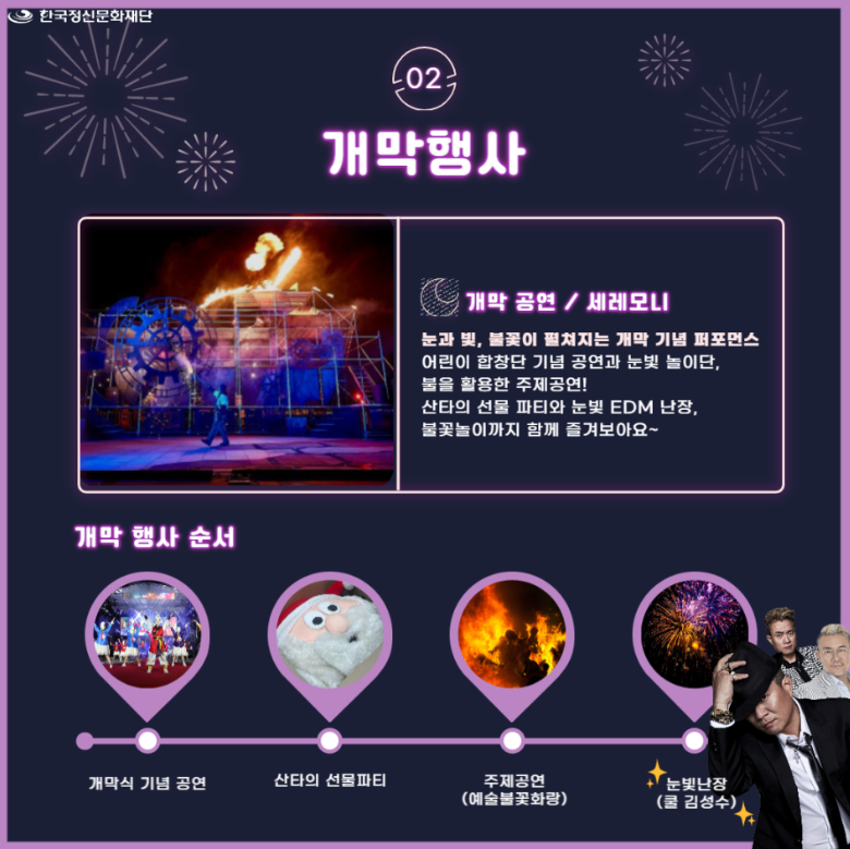 개막식 기념 공연, 🎅🎊선물 파티, 주제공연🔥, 눈빛 난장💿, 불꽃놀이🎇🎆