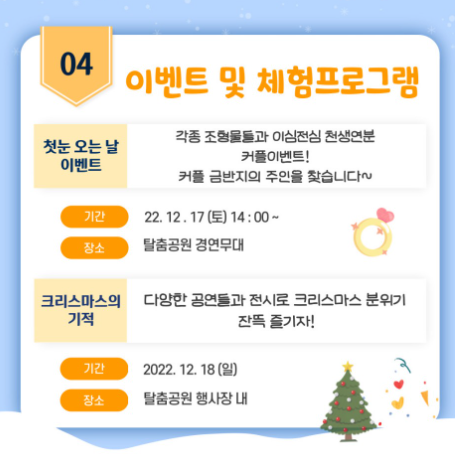 행사시간 : 매주 월요일 휴장(2023.01.23 제외) / 평일: 10:00 ~ 20:00 / 주말,공휴일: 10:00 ~ 21:00 / * 눈썰매장 10:00 ~ 17:00