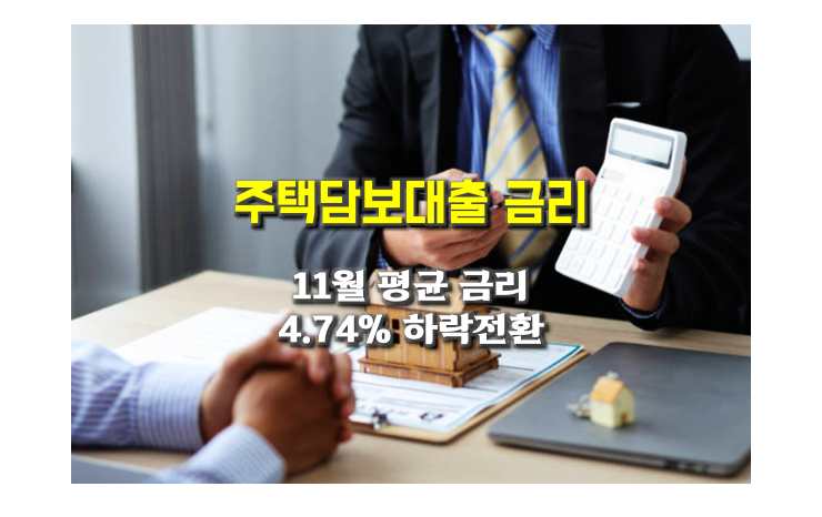 11월 주택담보대출 평균 금리 연 4.74%를 기록했습니다. 주택담보대출 금리가 하락한 것은 지난 3월(-0.04%포인트) 이후 8개월 만입니다.