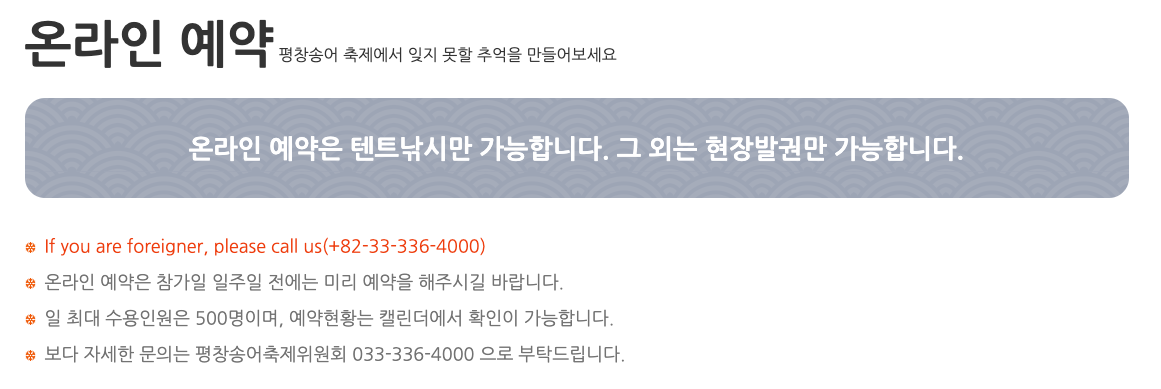 텐트 낚시는 평창송어축제홈페이지( www.festival700.or.kr)에서 예약 필수, 기타 프로그램은 현장에서 구매