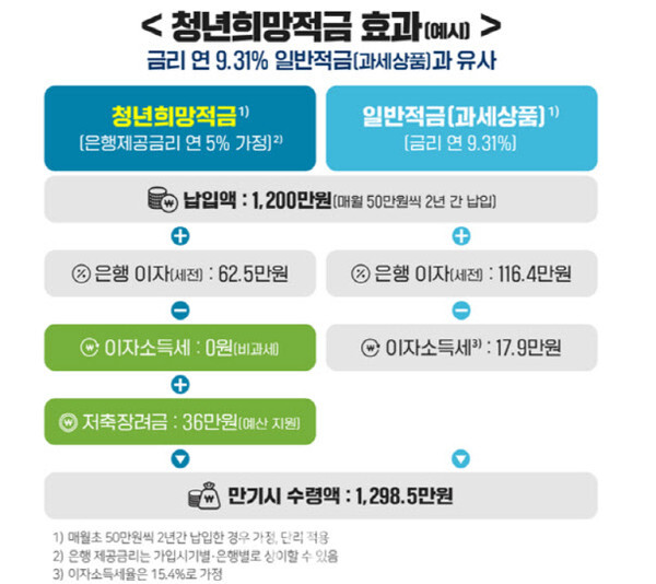 청년희망적금은 문재인 정부의 대표적인 청년 지원 정책금융상품으로 총급여 3600만원(종합소득금액 2600만원) 이하인 만 19∼34살 청년 중 2019∼2021년 중 한 번도 금융소득종합과세 대상이 아니었던 경우 가입이 가능했던 자유적립식 적금 상품입니다. 50만원씩 2년간 꼬박꼬박 납입하면 만기에는 원금 1200만원에 이자와 저축장려금으로 108만원을 손에 쥘 수 있다. 연 이자율로 치면 9%를 적용받을 수 있는 상품입니다.
